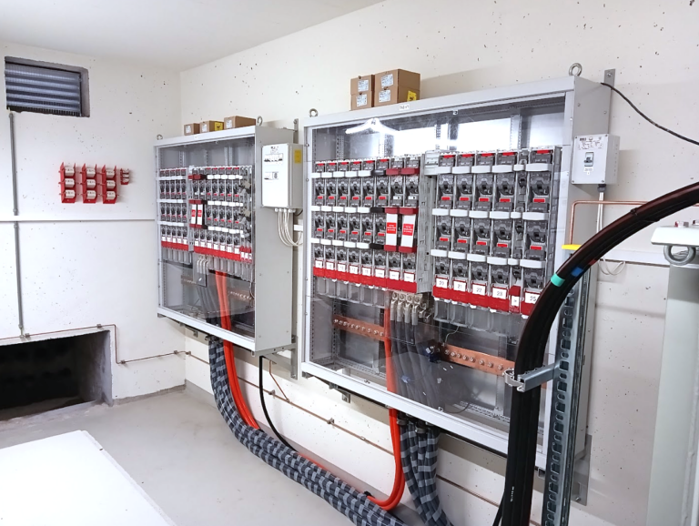 Immeuble et industrie : TGBT (tableaux), raccordement jusqu’au tableau général du bâtiment, tirage au sol avec machine pour enterrer les câbles.
